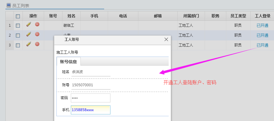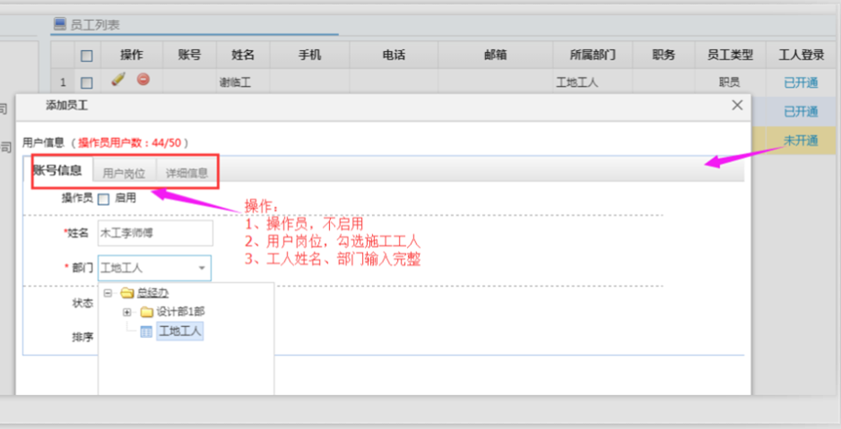 2、添加工人賬戶部門、崗位添加完成,即可在員工管理中,選擇工人部門,添加工人信息。注意:操作員不啟用,用戶崗位選擇“施工工人”。員工信息添加完成即可開工工人登陸賬戶。如下圖所示:
