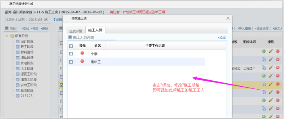 3、將工人關(guān)聯(lián)工程在添加施工計(jì)劃中,可將施工工人關(guān)聯(lián)到施工明細(xì)。如下圖所示: