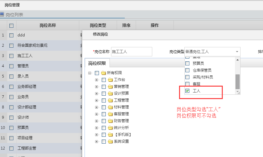美佳裝飾管理軟件新增施工工人工資管理,這部分功能方便裝飾公司直接管理工人,工人關(guān)聯(lián)工程后可自行通過手機(jī)端申請工資,查看已領(lǐng)、未領(lǐng)款項(xiàng)情況。工人工資也可由項(xiàng)目經(jīng)理代申請,使平臺(tái)方便各個(gè)崗位人員使用。 1、添加工人崗位崗位,在系統(tǒng)設(shè)置—部門/用戶,部門管理、崗位管理,將施工工人添加完成,需要注意,添加崗位的時(shí)候,勾選上“工人”崗位類型。如下圖所示: