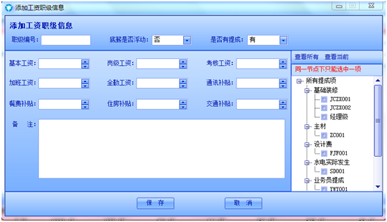 添加和修改工資職級時(shí),建議先輸入職級編號,選擇底薪是否浮動,是否有提成,因?yàn)檫x擇不同的選項(xiàng),界面會發(fā)生相應(yīng)的變化。如圖是添加職級的界面。