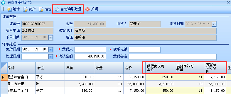 供貨商審核增加“自動(dòng)讀取數(shù)量”功能,將訂單中材料單價(jià)、數(shù)量讀取到確認(rèn)單價(jià)和數(shù)量中。有助于供應(yīng)商更快捷、有效、準(zhǔn)確的確認(rèn)材料單價(jià)和數(shù)量。