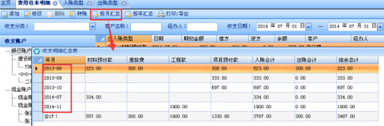 費(fèi)用往來(lái)明細(xì)增加收支明細(xì)匯總功能:按月匯總、按年匯總;
