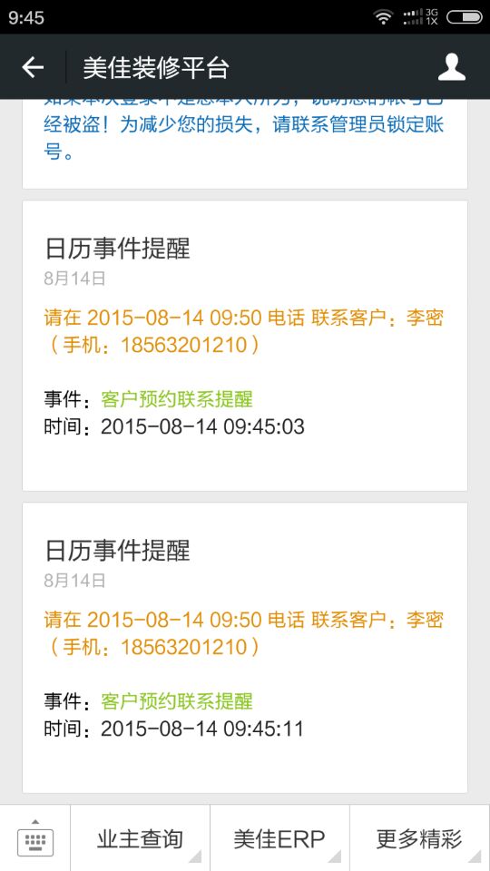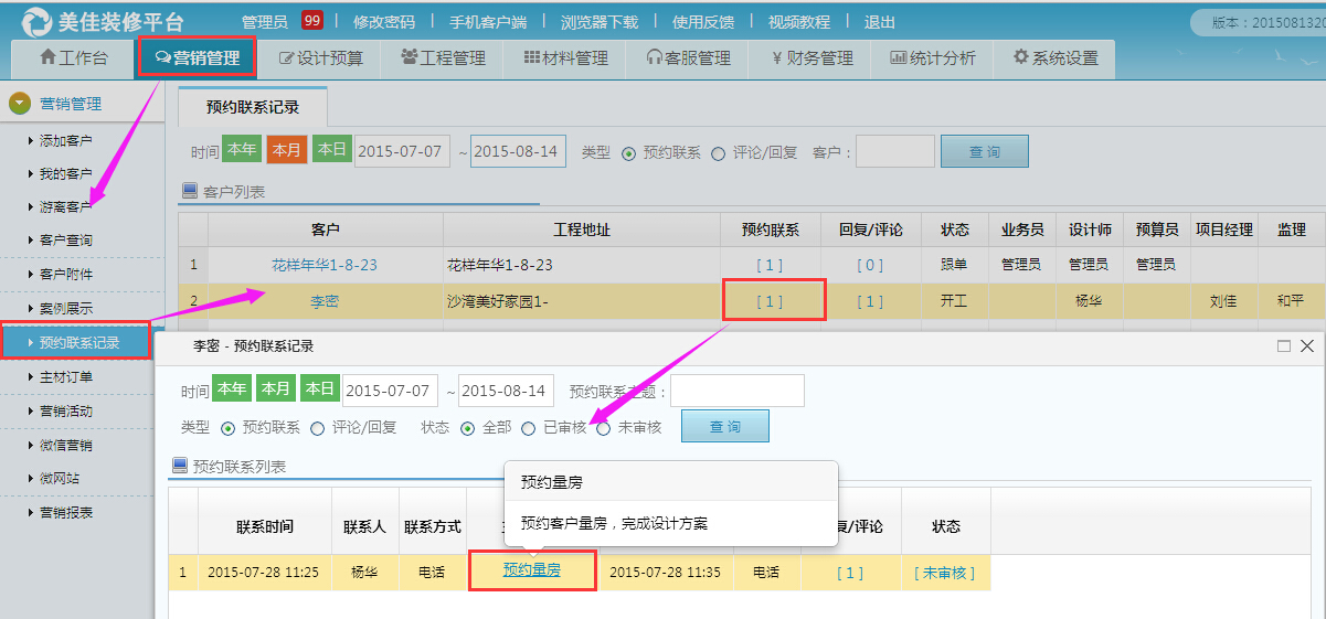 家裝業(yè)務(wù)員、設(shè)計(jì)師們注意啦!現(xiàn)在使用美佳裝修管理平臺或手機(jī)APP對客戶預(yù)約管理,系統(tǒng)會通過微信、短信自動(dòng)提醒、催促你跟客戶聯(lián)系。并且直到你在系統(tǒng)中添加跟進(jìn)情況后,系統(tǒng)才會停止提示。