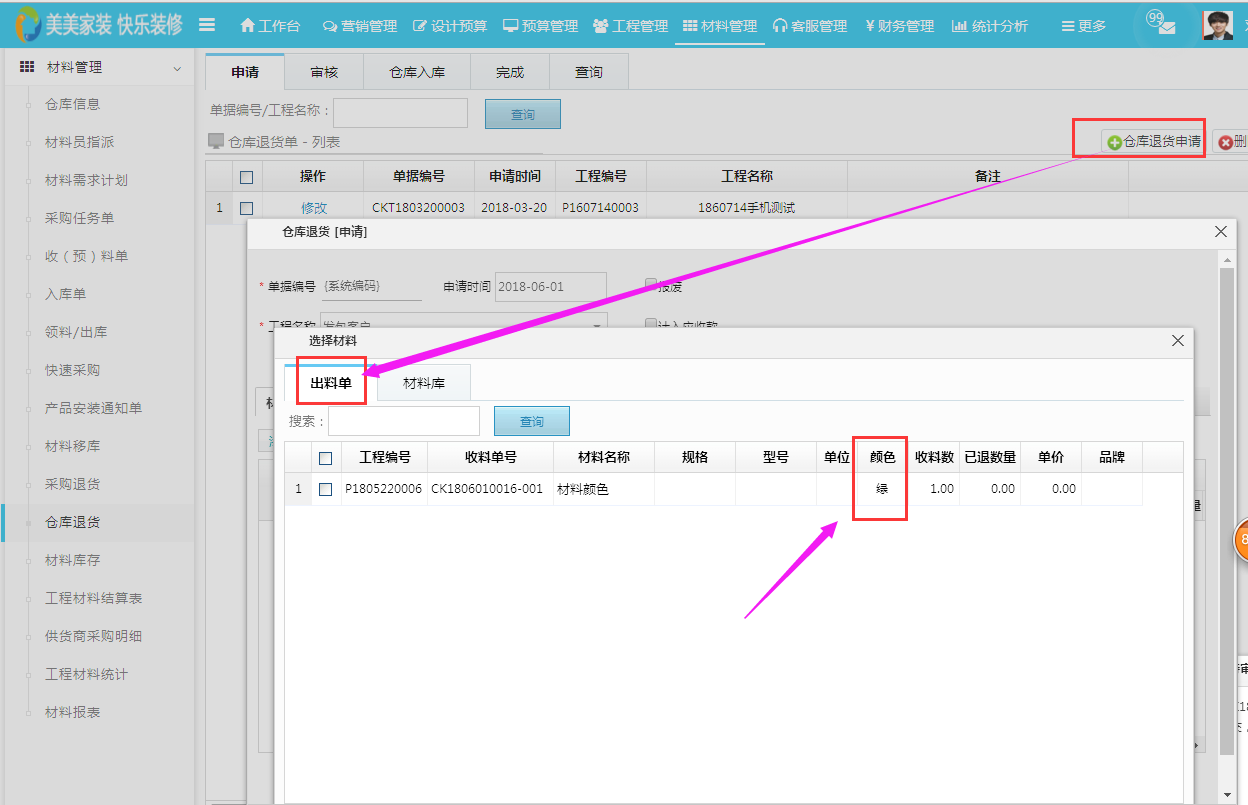 1:選中出庫單中材料:默認(rèn)材料顏色為制作領(lǐng)料/出庫單申請時選中的材料顏色;