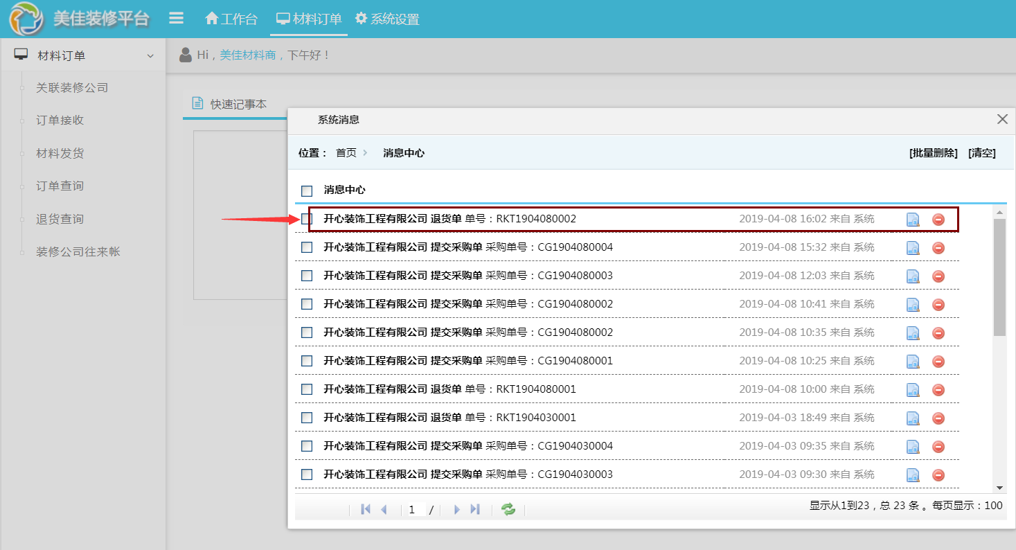 材料商于一體的信息化管理平臺,不斷在完善各種功能,滿足裝修公司的所有個性化需求,近期新增材料商退貨查詢、退貨消息通知。以達到材料商與裝修公司的溝通零等待,避免錯漏信息。