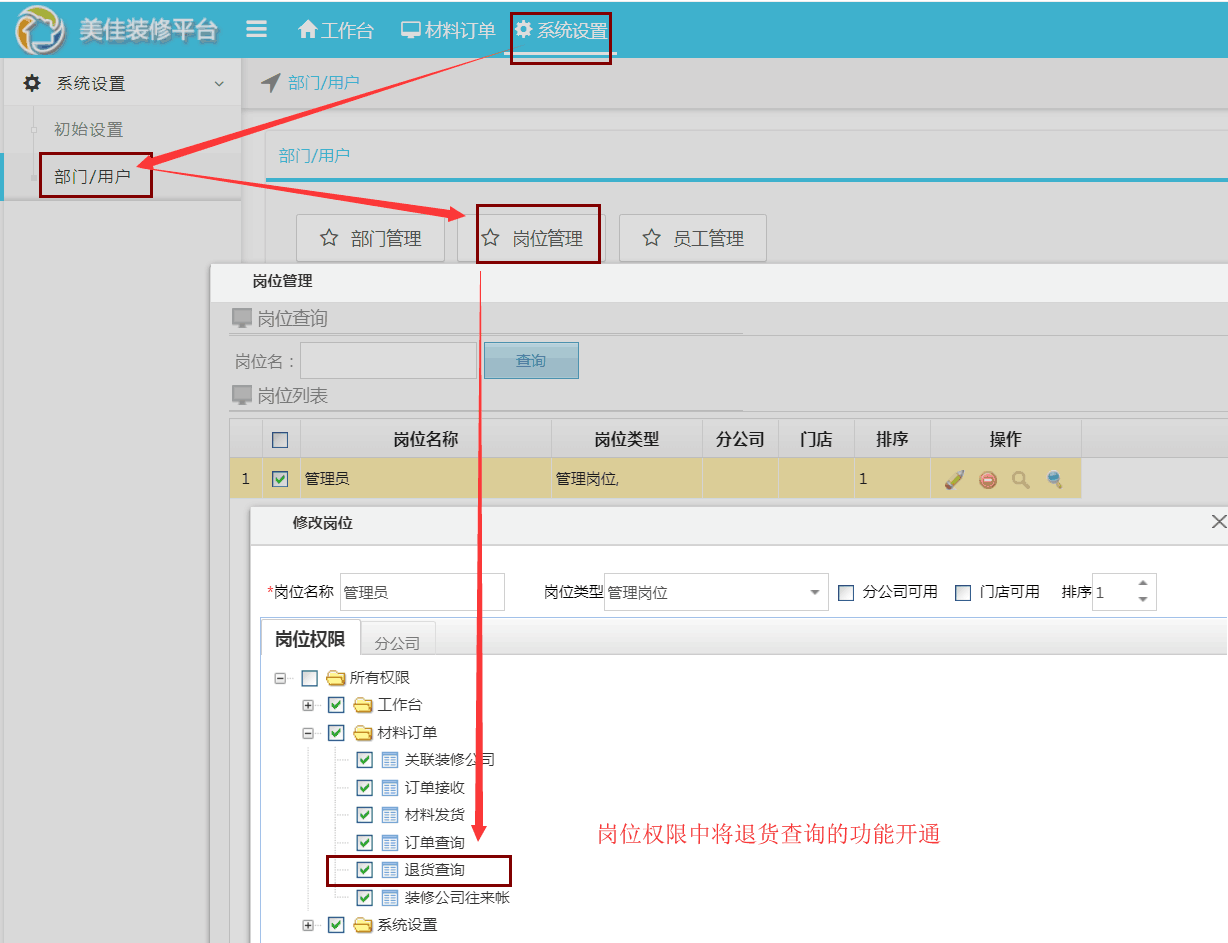 1、首先在【系統(tǒng)設置】—【部門/用戶】—【崗位管理】中勾選退貨查詢的選項,打開崗位此項權限之后該崗位就能接收到通知。