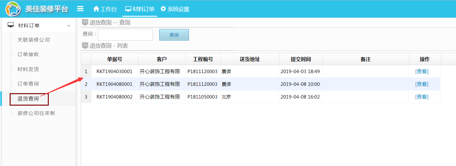 依次進入材料商的材料訂單—退貨查詢—查看(選擇對應的客戶退貨單)