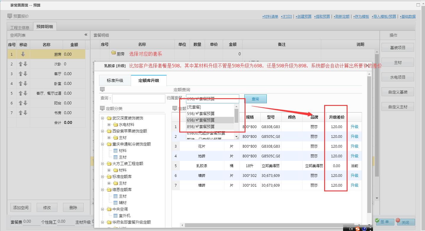 3、制作預(yù)算,套餐預(yù)算材料升級(jí)時(shí)從定額庫(kù)選擇須要升級(jí)到哪個(gè)套系材料,圖示: