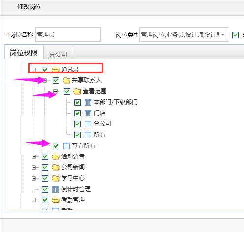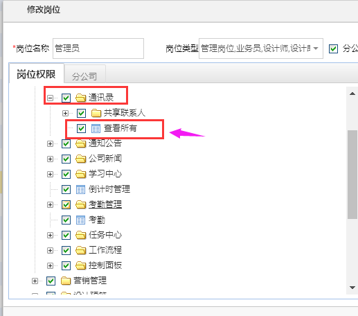 依次點(diǎn)擊系統(tǒng)設(shè)置---部門/用戶---崗位管理---工作臺(tái)---通訊錄---勾選所有