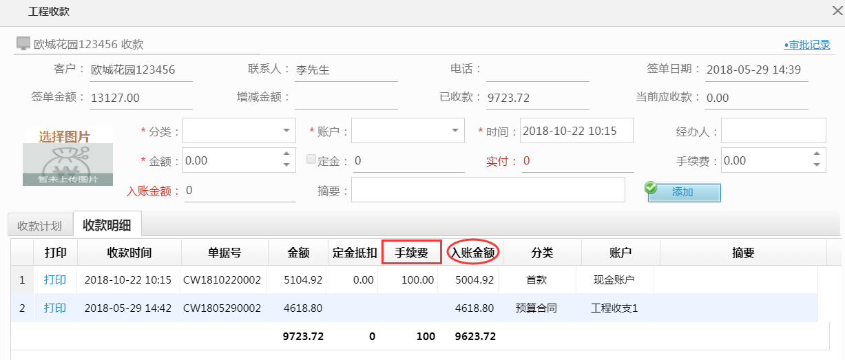資金回籠是一個公司的首重之重,對于收款的各個名目管理也是讓人抓破頭皮,管理明細賬的冗雜也是讓人很無力,近期美佳技術人員在搜集各位客戶的需求時針對這一現(xiàn)象優(yōu)化了工程收款相關明細。在收款界面新增手續(xù)費,扣除手續(xù)費后直接生成入賬金額。具體操作如下所示: